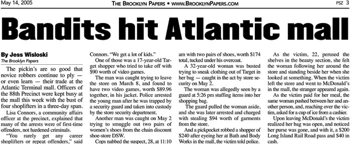 The pickin’s are so good that novice robbers continue to ply — or even learn — their trade at the Atlantic Terminal mall. Officers of the 88th Precinct were kept busy at the mall this week with the bust of four shoplifters in a three-day span.