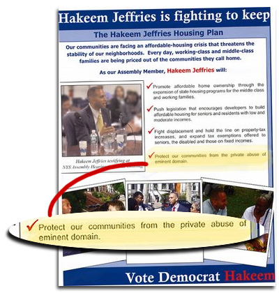 "Private abuse of eminent domain?" Huh? What we have with Atlantic Yards is a public and private abuse of eminent domain. How can Jeffries hold this position while at the same time talking about a "principled compromise" at Atlantic Yards. Either you are for or against the use of eminent domain for Atlantic Yards.