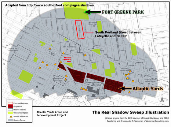 This map showing So. Portland Ave. is adapted from Chapter 9 of the DEIS, on Shadows, as modified by the So. Oxford Block Association (some readers may recall that the DEIS used "limoncello" yellow to represent the shadows; the So. Oxford St. Block Association thought that gray would be more appropriate).