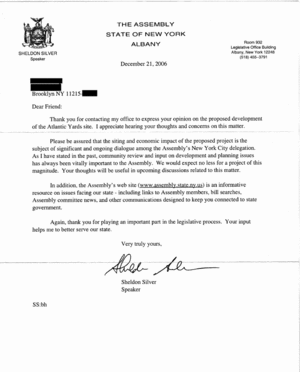 This letter from Assembly Speaker Sheldon Silver, dated December 21, arrived at our "production department" on December 26. Speaker Silver is thanking the concerned Brooklynite for their input, stating, "Your thoughts will be useful in upcoming discussion related to this matter." The Speaker voted to approve Bruce Ratner's Atlantic Yards project on December 20.