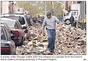 A portion of the parapet wall on the five-story former Ward Bakery building in Prospect Heights came crashing onto the sidewalk outside 800 Pacific St. at 9:48 a.m. The collapse showered the sidewalk with bricks and caused the two adjoining buildings, including a shelter for homeless women and children, to be evacuated, the fire department said. Several cars parked on the street were damaged.