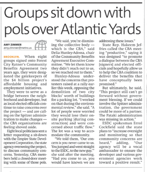 Eight local politicians sent a letter requesting a sit-down with the Empire State Development Corporation the state agency overseeing the project, to discuss community concerns. Yesterday, CBA members held a closed-door meeting with some of those pols.