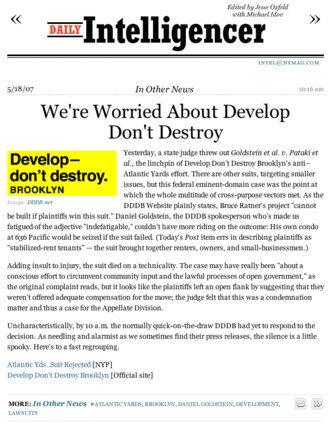 The emotional tenor of their headline "We're Worried About Develop Don't Destroy" is understandable since the magzine's blog reported, "Yesterday, a state judge threw out Goldstein et al. v. Pataki et al., the linchpin of Develop Don't Destroy Brooklyn's anti–Atlantic Yards effort." Uh, NOT!