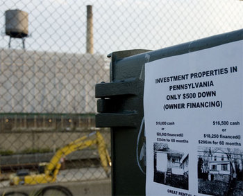 Live on the scene of Bruce Ratner's Atlantic Yards project, the doomed Ward Bakery Building—scene of the parapet collapse back in April—looms in the background, while exciting investment opportunities come to the fore. ONLY $500 DOWN, friends! Grab 'em before Bruce does! |