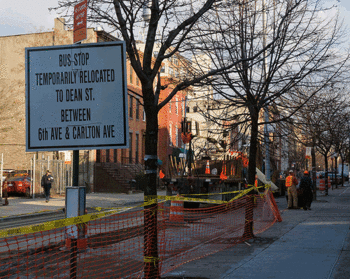 In case bus riders aren't diligently reading NoLandGrab or didn't get the Atlantic Yards Construction Update, a sign has finally been posted, alerting riders that the B65 bus stop has been temporarily relocated.