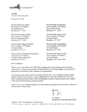 The eight elected officials who asked the state for an independent study of Atlantic Yards security got a cordial brush-off from the Empire State Development Corporation (ESDC), which sent a brief November 30 letter (right, click to enlarge) reiterating that, just as Madison Square Garden operates without street closures, so could the Atlantic Yards arena.