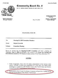 I didn't believe it would happen. A Forest City Ratner representative was supposed to address the Housing/ULURP Committee of Brooklyn Community Board 8 on Thursday, providing "an update on the first and second phases of the Atlantic Yards project," according to a memorandum sent to committee members. (Click to enlarge.)