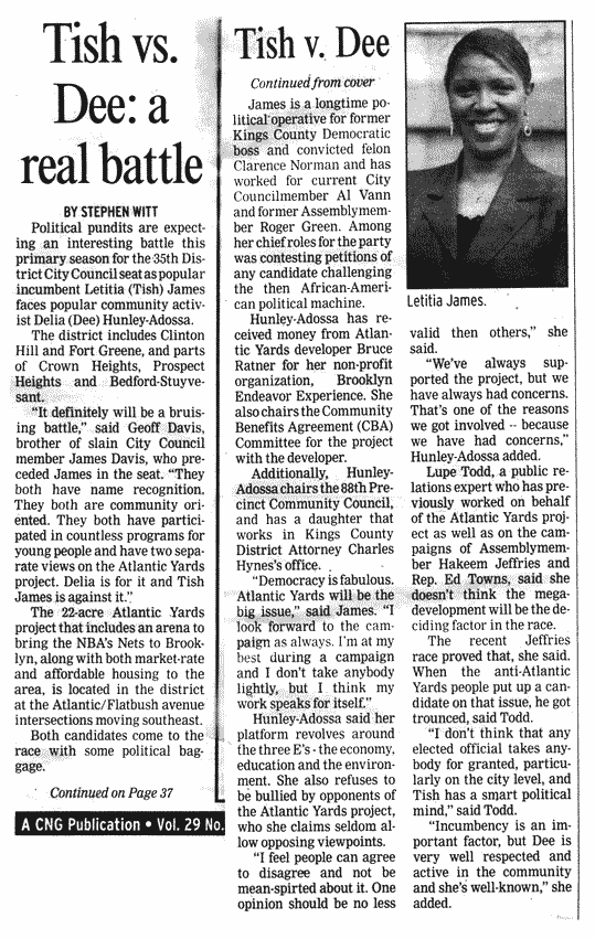 Though the Courier's Witt does his best to tar City Council member and outspoken Atlantic Yards opponent with the brush of Brooklyn's disgraced Democratic political machine (despite her distinguished record advocating for her community in the Council, he opts to describe her as "a longtime political operative for former Kings County Democratic boss and convicted felon Clarence Norman"), the truth is that James's declared primary opponent, Delia Hunley-Adossa, is the actual machine candidate and that machine is the Ratner machine.