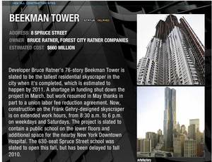 One site that signed up for the plan was developer Bruce Ratner's Beekman Tower in the Municipal District, a Frank Gehry-designed apartment building that almost lopped off the top 36 floors of the planned 76-story building when financing evaporated earlier this year.Thanks to the labor savings, the project is now working overtime to reach its full height by the time it is slated to open in 2011.