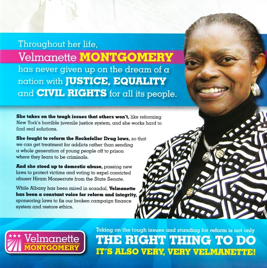 State Senator Velmanette Montgomery can point to some real achievements, as noted in a campaign mailer (right; click to enlarge), such as reforming the juvenile justice system and the Rockefeller drug laws.