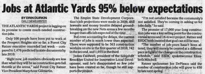 Forest City Ratner and the Empire State Development Corporation (ESDC) promised that Atlantic Yards would mean jobs, jobs, jobs—especially construction jobs. Depending on the day or year they've promised 7,000 construction jobs, 10,000 construction jobs. Well Erin Durkin at the Daily News reports today that Ratner's project lags way behind its overhyped job projections and there appears to be no improvement on the horizon or on schedule.
